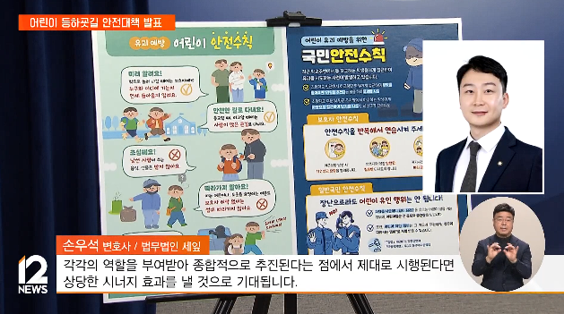EBS 뉴스 - 법무법인 세잎 손우석 변호사 인터뷰     법무법인 세잎 손우석 대표변호사는 최근 EBS 뉴스와의 전화 인터뷰를 통해, 정부가 발표한 어린이 등하굣길 안전대책에 대한 논평을 진행했습니다.     이번 대책은 어린이유인 범죄 등 아동 대상 범죄를 예방하고, 보다 안전한 통학 환경을 조성하기 위한 종합적인 방안으로 주목받고 있습니다.     손우석 변호사는 인터뷰에서 "형사적 대응, 행정적 관리, 교육적 예방이 종합적으로 추진된다면 큰 시너지 효과를 낼 것으로 기대된다"며, 사회 전반의 공감대 속에서 다양한 분야의 논의가 이루어지는 점을 긍정적으로 평가했습니다.  ...