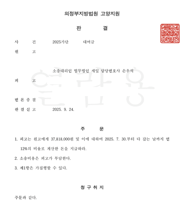 청구취지와 주문이 같다는 말은, 원고가 청구한 것 중 하나도 빠짐없이 모두 인용되었다는 것입니다.