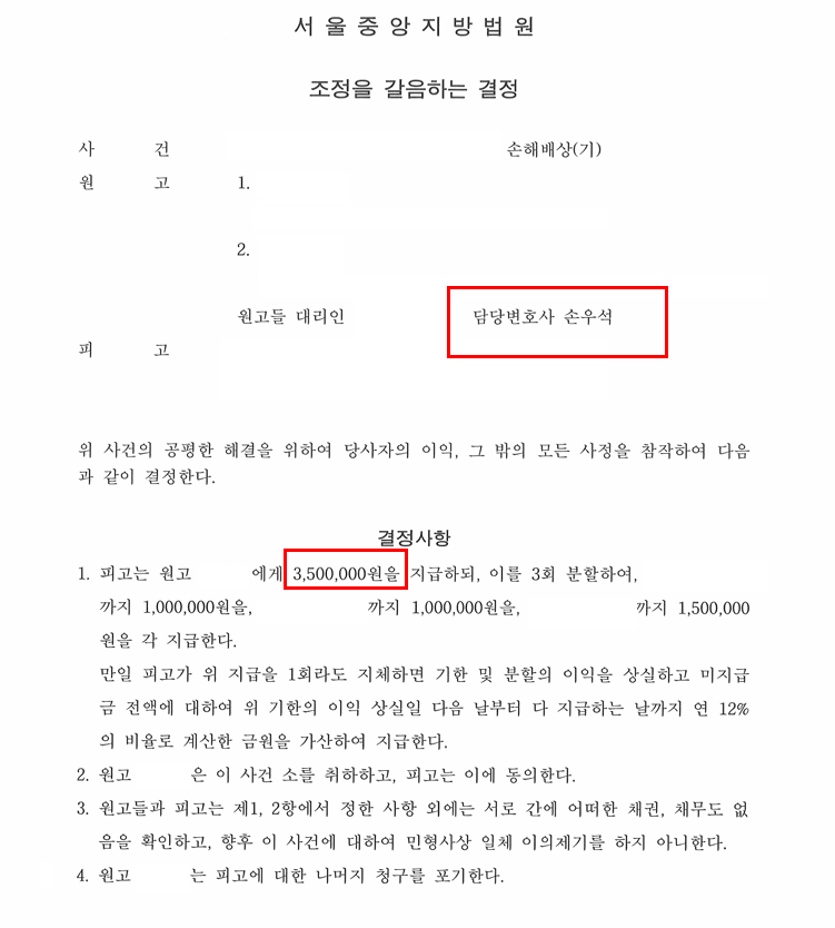 손우석변호사는 그러나 의뢰인이 받은 충격을 마음 깊이 이해하고 이를 재판부와 조정관에게 서면으로 전달하는 방식으로 통상적인